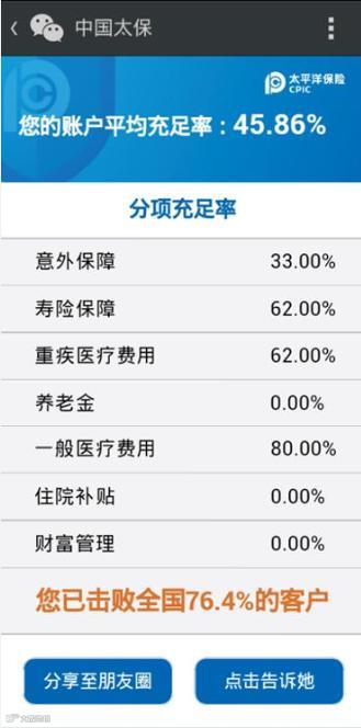 中国太保官微将为您打造一款检测神器,您只需输入年收入,即可查询您的保险账户总体充足率以及各类保障的充足水平。