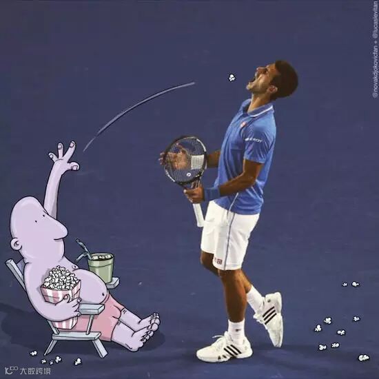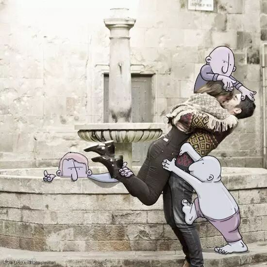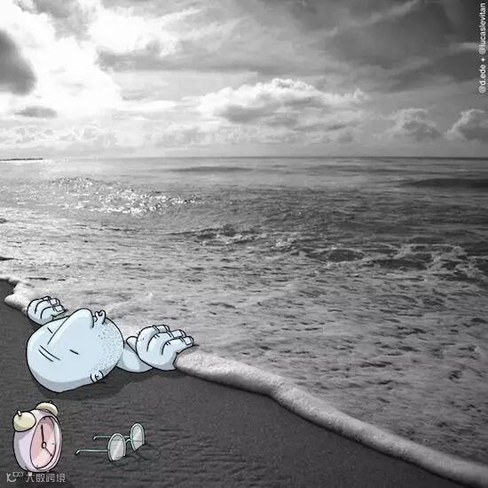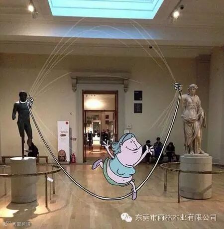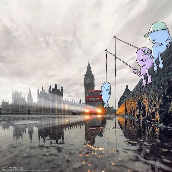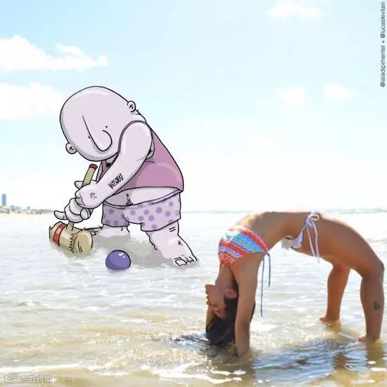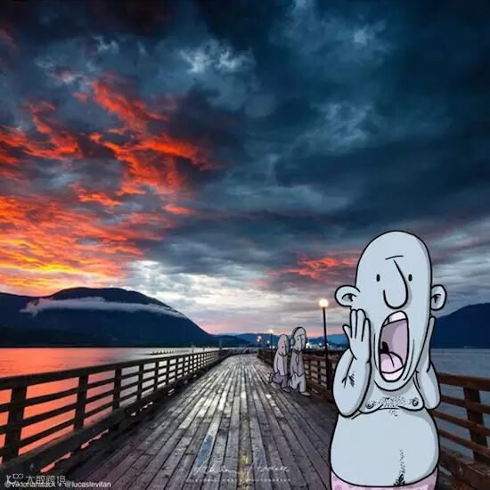 他将自然环境:海滨、桥梁、峭壁、街道和有趣的漫画人物结合,照片上的自然形态与漫画相组合就有了另外一种属性。比如壮阔的海岸线在画家笔下成为了漫画人物细心剪裁的一片布料;一览众山小的登顶者配上顽皮的漫画人物马上有了坠崖的危险!