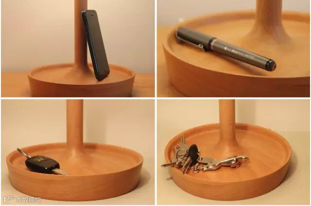而且这款灯能够在下方的底座中放置小物品,回家打开灯将手中的钥匙随意放在盘中,方便拿取也不易忘记。暖色灯光加上榉木的暖色即便是冰冷的手机也看起来温暖多了,「好设计是实用的」,有时候也是多用的。