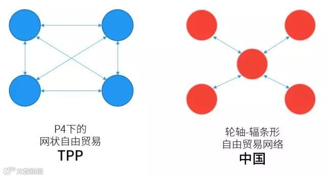 对中国而言,不加入TPP,但可以和这些国家分别签署类似的协议啊! 比如中国可以和澳大利亚签署,可以和秘鲁签署,当然因为这样的方案,仅限于中国和这两个国家,澳大利亚和秘鲁之间不会因此出现类似的关系,所以是一个类似自行车轮轴的结构,中国是当中的轴,然后周边有一堆的签署国。这个结构,就被称为轮轴-辐条 (Hub and Spokes)形FTA网络。