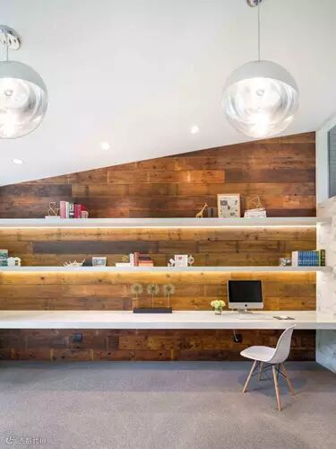 不规则的阁楼以整齐的三条壁桌轻松打造出规整感。原木配纯白,自然里清新感觉。两款吊顶让这款阁楼书房瞬间溢出高大上。