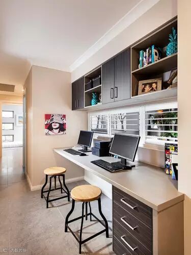 在家里的拐角处,依靠墙设计壁桌和壁柜造就舒适简约的双人办公区。在过道的凹处,起到了很好的隔离作用。