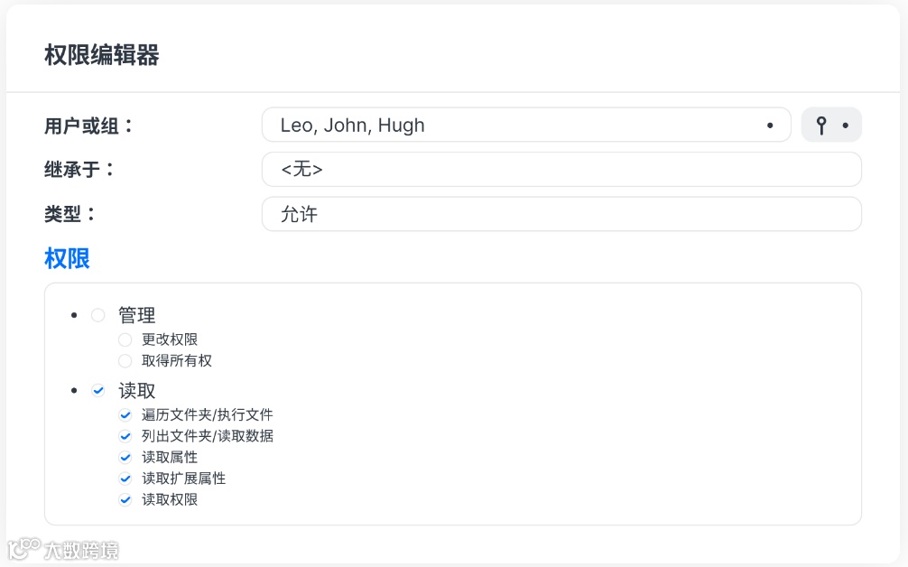 支持 Windows ACL 13 种权限,通过图形化界面,以勾选的方式,快捷为用户设置权限。