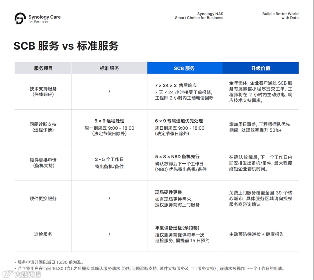 Synology Care for Business(以下简称“SCB 服务”)是群晖专为企业用户量身打造的专业技术支持服务,旨在保障企业群晖NAS 服务器稳定运行,快速解决硬件和软件问题。