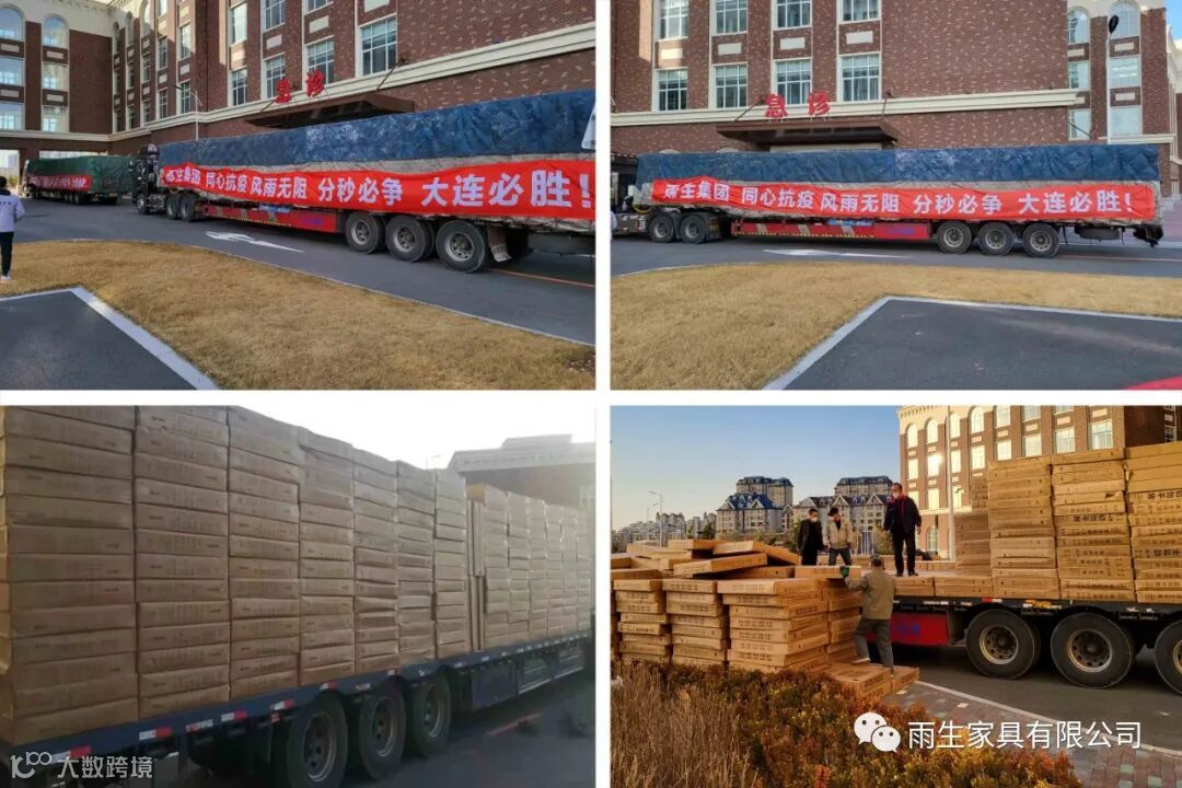 3月26日早晨6时许,晨雾刚刚散去,雨生集团大连生产基地大型集装箱发货平台上已经是一片忙碌的景象,十几辆叉车穿梭来往,近百名员工挥汗如雨地将1500套刚刚打包好的折叠床快速地搬运上两辆17米长的大型挂车,而这两辆大挂车也将载着这批防疫应急物资驰援位于普兰店区的大连市新冠肺炎方舱医院,确保方舱医院能够在第一时间启用。