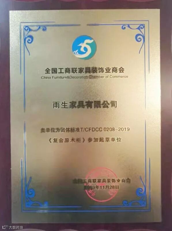 本次会议上,全国工商联家具装饰业商会还对最新颁布的四项家居行业团体标准起草单位正式颁发了荣誉证书。其中,雨生集团参与主编了《定制家居产品安装服务规范》和《复合原木柜》两项标准。雨生集团作为全国工商联家具装饰业商会副会长单位,多年来积极参与和主编了几十个国家标准、主流行业标准及团体标准,以切实的行动积极推进家居行业的规范化、标准化进程。