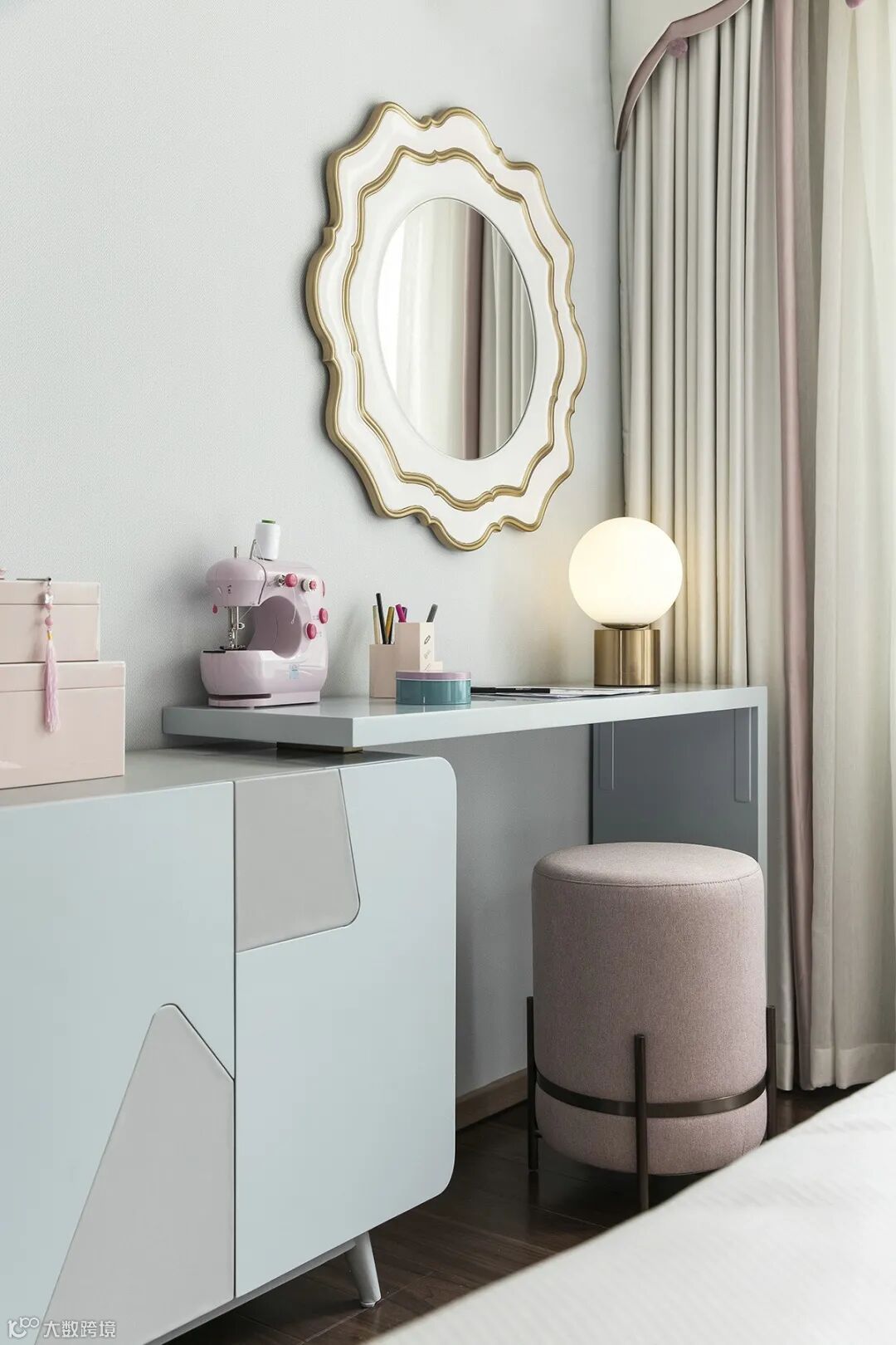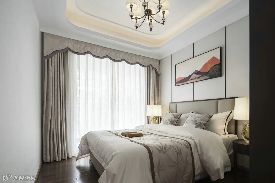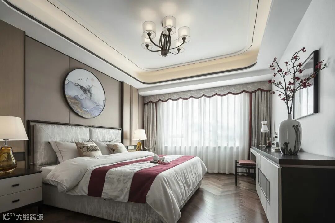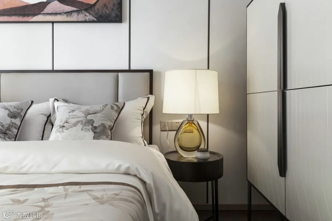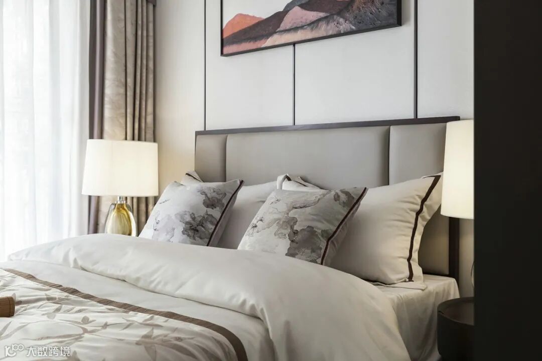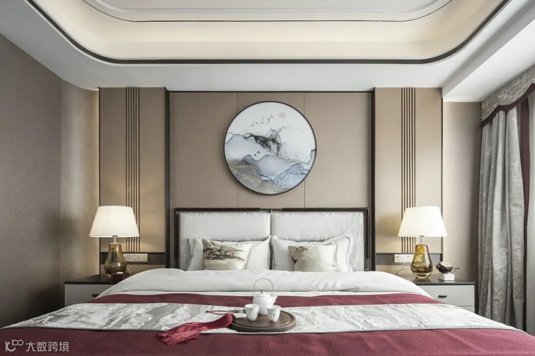 古往今来,卧榻必有讲究,讲气度、讲精致、讲品位、讲情怀。主卧严整的格局与平和的调性浑然一体,配合白瓷、玉石、流苏等精巧文物,满室风雅,彰显着大家风范。春意恣意挥洒, 韵气流溢其间。此处的挂画也极其考究,取大川山河之形,再以抽象化创作,像极了水墨之境,再镶金边。