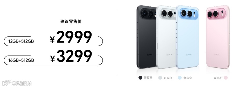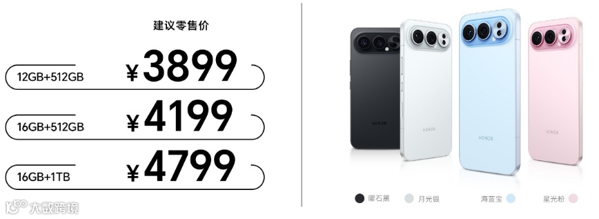 荣耀500系列共带来“海蓝宝”、“星光粉”、“月光银”、“曜石黑”4款水晶配色,售价方面,荣耀500标准版12GB+512GB和16GB+512GB版本售价分别为2999元和3299元;荣耀500 Pro版12GB+512GB、16GB+512GB和16GB+1TB版本售价分别为3899元、4199元和4799元。现已在荣耀体验店、授权零售门店开启预售,并于11月27日10:00正式开售,首销购机赠价值999元尊享服务。