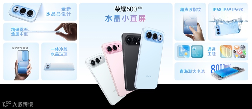 荣耀500系列还采用行业领先的一体冷雕工艺,历经40多道工序反复打磨,实现了镜头模组与背板玻璃的一体成型,质感浑然天成。得益于机身架构的重构,不仅实现7.75mm的轻薄机身和行业最窄1.05mm黑边,其独特的水晶岛镜头模组设计,也带来了更优的握持体验,无论是竖屏使用还是横屏游戏都舒适趁手,同时为超大电池预留出充足空间。
