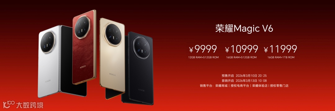 荣耀Magic V6共提供12GB+512GB、16GB+512GB、16GB+1TB三个版本,售价9999元起。新品已即刻开启预售,并将于3月13日上午10:08,在荣耀体验店、授权零售门店正式开售。