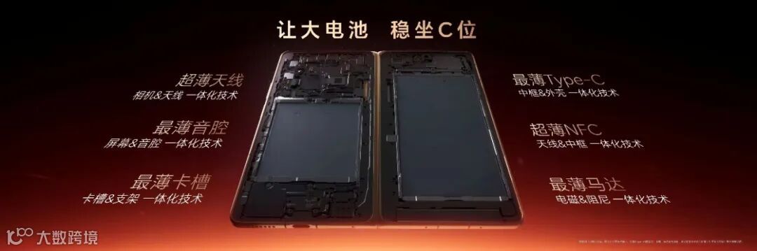 在内部设计方面,为了在极限空间里给电池留下足够空间, 荣耀Magic V6针对内部空间做了系统性考量,对天线、音腔、卡槽、Type-C、NFC、马达等组件进行极致轻薄化处理,让电池稳坐C位。