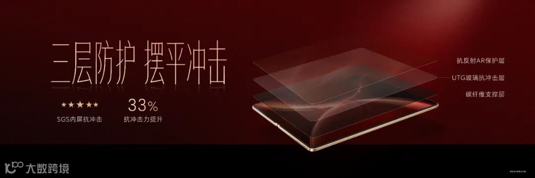 内屏同样有至臻黑钻屏旗舰素质。全新升级超韧UTG玻璃,折痕相比上一代产品改善44%,通过了SGS无感知折痕认证,呈现出仿佛没折的平滑效果。同时,通过碳纤维支撑层、UTG玻璃抗冲击层、抗反AR保护层等三层防护,抗冲击力提升33%,由内到外,可靠属性拉满。