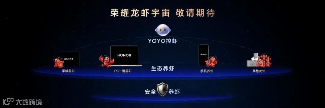 发布会上,还公布了生态级的荣耀龙虾宇宙,支持PC一键养虾、平板养虾,未来还能兼容其他生态设备的龙虾接入。用户可以通过YOYO在荣耀手机上直接和小龙虾交互,并安全地开放手机智能体供小龙虾调用,实现生态养虾、安全养虾和YOYO控虾三大能力。这些功能将于近期陆续开放内测。