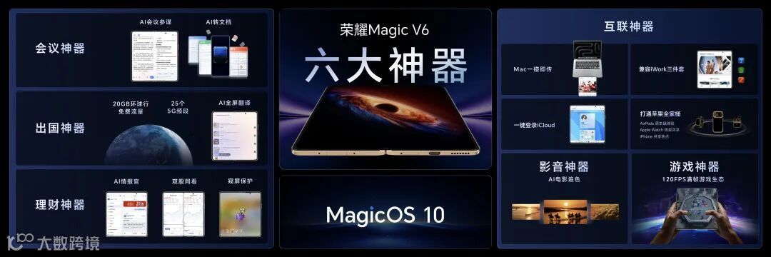 如果说硬件实力决定折叠屏的性能边界,那么AI和生态等软件能力则决定折叠屏的好用程度。此次荣耀Magic V6不仅在硬件创新上实现“全满贯”,在软件配置上也同样能打。荣耀Magic V6带来会议、理财、出国、影音、游戏、互联六大场景的“六大神器”软件体验。