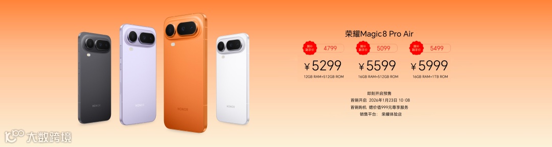 售价方面,荣耀Magic8 Pro Air 12GB+512GB、16GB+512GB和16GB+1TB版本售价国补后分别为4799元、5099元和5499元。现已在荣耀体验店开启预售,并于2026年1月23日10:08正式开售,首销购机赠价值999元尊享服务。
