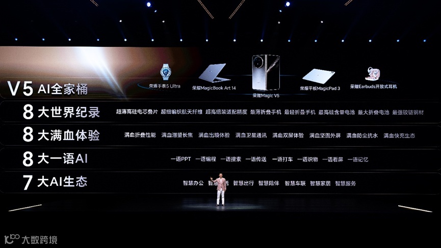 荣耀CEO李健现场发布新品,秉持科技与人文结合理念,致敬“比想象更强大”的时代中坚力量。李健表示:“科技的目的不是取代人,而是充分释放人的潜能,让每一个人成为更好的自己”。作为荣耀转型AI终端生态公司的首款旗舰产品,荣耀Magic V5以一步不退的极致追求、一毫米的极限探索、一小时的生命宽度和一辈子的温情陪伴,兑现最大限度释放潜能的承诺。