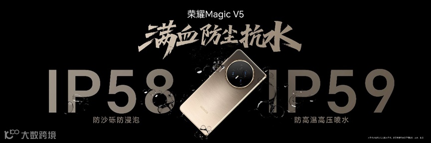 在可靠性方面,荣耀Magic V5搭载新一代金刚巨犀玻璃,防摔、防磨、防刮;满血防尘抗水,全系支持IP58和IP59。