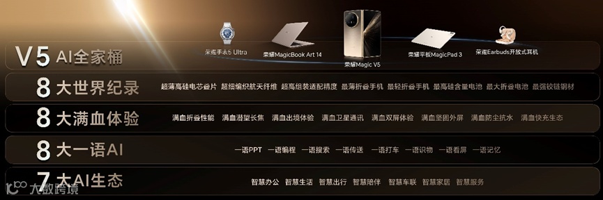 此外,本次发布会荣耀还带来AI终端生态家族的全家桶旗舰新品:荣耀MagicBook Art 14 2025上线一语智控功能,开启AI PC自动驾驶时代,售价8499元起;荣耀平板MagicPad 3首发全局 AI 生产力,打造13.3英寸大屏旗舰最强AI平板,售价3299元起;钛合金蓝宝石高端旗舰手表荣耀手表5 Ultra首发防猝筛查研究,24小时守护心脏健康,重新定义腕上智能健康,售价1999元起,荣耀Magic V5用户专享优惠价1799元起;荣耀Earbuds开放式耳机支持AI翻译,随时调用YOYO,是用户贴身的AI私人助理,售价699元起。