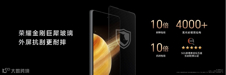 更为出色的是,荣耀Magic V3搭载的是轻薄折叠铰链结构,厚度仅有2.84毫米,采用强度高达2100Mpa的第二代荣耀盾构钢,抗冲击性能提升100%。手机机身更是业界首创航天特种纤维,抗冲击性能是iPhone 15 Pro Max的40倍。在屏幕保护上,荣耀Magic V3的外屏采用荣耀金刚巨犀玻璃,基于第二代纳米微晶玻璃技术,全场景抗跌能力提升了10倍,同时使用氮化硅镀晶技术,独创4000+叠层设计,实现10倍抗刮耐摔;内屏搭载荣耀金刚柔性装甲,通过抗冲硅凝胶材料+纳米级氧化铝涂层,耐磨和抗冲击性能分别提升5倍和20%。此外,荣耀MagicV3的荣耀鲁班铰链经过了50万次折叠测试,1万次弯折测试后,屏幕折痕深度控制出色,仅为78微米;且产品支持IPX8防水等级,成为唯一通过2.5米防水认证的折叠屏手机,为用户提供了全面、安心的折叠屏使用体验。
