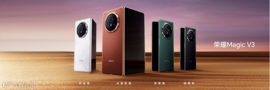 在轻薄机身下,荣耀Magic V3采用了穹顶八边的居中影像模组设计,荣耀Magic Vs3则是极目星环的侧置影像模组设计。荣耀以华夏壮丽山河之景、丝绸之路沿途风光演绎产品配色,两款全新折叠屏均包括绒黑色、苔原绿、祁连雪三种配色,荣耀Magic V3更独享全新的“丝路敦煌”配色,借鉴大漠戈壁的恢弘、壁画艺术的震撼,仿佛展开了一幅精美绝伦的历史画卷,尽显奢雅格调。