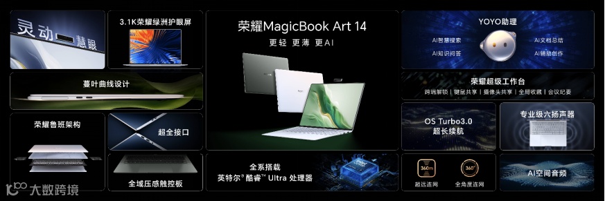 荣耀笔记本也迎来了旗舰新成员——荣耀MagicBook Art 14。作为全新的高端超轻薄AI PC,荣耀MagicBook Art 14与荣耀Magic V3同样采用荣耀鲁班架构,包含航天级创新材料及创新架构设计,带来薄约1cm、轻至1.03kg的超轻薄机身,突破技术极限薄出新高度;荣耀MagicBook Art 14首创磁吸式灵动慧眼摄像头设计,带来14.6英寸3.1K OLED触控好屏和PC行业最高的97%屏占比,并支持4320Hz超高频PWM零风险调光和荣耀绿洲护眼技术,通过多重权威护眼认证,引领PC行业护眼标准。