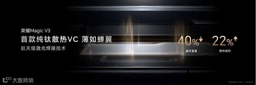 性能方面,荣耀Magic V3搭载第三代骁龙8旗舰芯片,并采用全新荣耀纯钛散热VC,首次采用钛金属作为VC基材,让器件重量下降40%,散热面积提升22%。此外,荣耀纯钛散热VC还采用更高级别的航天级激光焊接工艺和行业首创钛金属钝化技术,保证了散热器的长期使用可靠性。