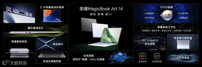 基于AI PC上的领先技术,荣耀把AI技术与用户体验全面融合,用AI使能智能硬件、人机交互和多端生态,构建更懂用户的AI PC体验。今年三月,荣耀首款AI PC荣耀MagicBook Pro 16以兼具轻薄、高性能、长续航的优势,以及“静音性能”模式的亮眼功能,赢得不少赞誉,开启了AI PC全新时代。作为超轻薄领域的首款AI PC产品,荣耀MagicBook Art 14在AI能力和体验上进一步升级,带来更符合用户实际使用需求的场景化人机交互体验,引领AI PC行业新的潮流。