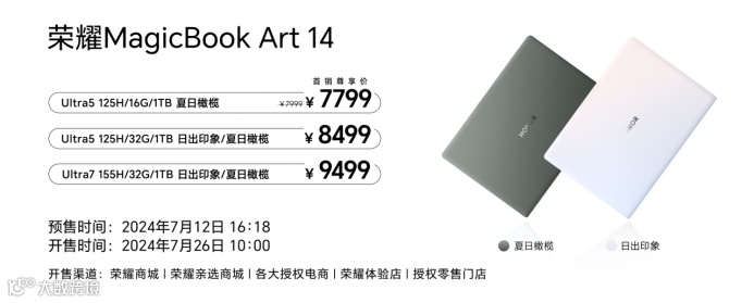 荣耀MagicBook Art 14为消费者提供多种配置选择,Ultra5+16GB+1TB首销售价7799元;Ultra5+32GB+1TB售价8499元;Ultra7+32GB+1TB售价9499元;7月12日16:18开启全渠道预售,7月26日10:00正式开售。