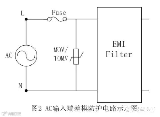 1. 在交流电源AC输入端浪涌保护方案,可以采用压敏电阻(MOV) 或加气体放电管(GDT/SPG)组合来进行设计。在有接地的情况下,可以采用如图1差共模同时防护的理念,在L-N之间并联压敏电阻(MOV),可以有效地抑制差模所产生的浪涌过电压,起到对后级电路保护,在L/N-PE之间分别采用MOV 或MOV+GDT/SPG对地的电路连接方式可以有效的将共模浪涌能量泄放到大地, 防止浪涌引入到后级电路而造成损坏;如果在电源没有接地线情况下,如图2则在L-N线间可直接并联压敏电阻进行差模防护即可。为了避勉MOV保护元件在防护失效之后,出现短路失效着火燃烧的可能性,可以使用TMOV或PMOV进行保护。针对上面MOV交流耐受电压选择至少要高于线路最大交流工作电压1.2~1.4倍,以避勉误动作,在有同时使用放电管GDT/SPG时,放电管击穿电压的下限值必须至少高于电路的最大峰值电压,耐受电流必须根据自身浪涌等级的需求选择不同电流等级,以符合于浪涌测试标准的要求。