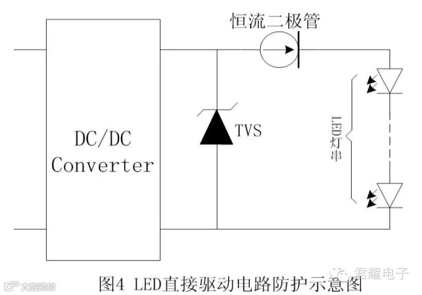 3. LED发光的亮度是由通过LED的电流大小来控制,不稳定的电流又极易烧坏LED,如图4在DC/DC模块后可以在电路中串联恒流二极管CRD来获得稳定的电流,,这样不仅可以使LED获得稳定的亮度,,又不至于因电流的不稳定而烧坏LED。低功率的LED灯工作电流一般为10mA到30mA,大功率的LED灯工作电流从200mA到1400mA不等,可以根据所需要的工作电流选择型号合适的恒流二极管。由于LED灯也易遭受到静电放电过压的干扰受损,因此DC/DC电路后端的LED灯也需要做一定的有效过压防护,一般采用TVS管就可以。