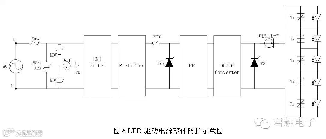 综上所述,LED驱动电路一般由AC输入、整流,、DC/DC转换等模块组成,从而一个LED驱动电路大致整体的防护方案可以参考如图6所示:
