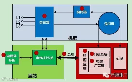 如图1所示,电梯系统主要由三个部分构成:机房、层站、轿厢。机房是电梯的控制中心,轿厢是运送乘客和货物的电梯组建,层站是电梯在当前楼层开门的站。君耀电子针对变频器、编码器、电梯外呼板、电梯主控板、总线、轿厢控制、门机系统、电梯广告等有可以通过EN12016标准的电路保护方案。