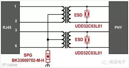 图7为100M以太网保护方案,隔离变压器之前采用玻璃气体放电管(BK33000702-M-H)进行第一级共模防护。BK33000702-M-H是一款小型化耐受型玻璃放电管,相对于陶瓷气体放电管具有体积小,反应速度快,价格便宜的优点。隔离变压器之后采用UDD32C03L01进行差模防护。UDD32C03L01是一款低压低电容高通流ESD防护器件,目前已大量应用于以太网的防护,得到客户的充分肯定。该方案可通过IEC61000-4-5 10/700μs 40Ω差模2kV,共模4kV的测试。