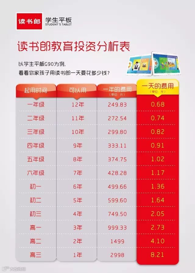 以目前读书郎产品系列中卖的最火爆的一款旗舰机型G90来计算。定价为2998的G90即便按照只能使用5年时间,换算下来一天的价格才1.64元。