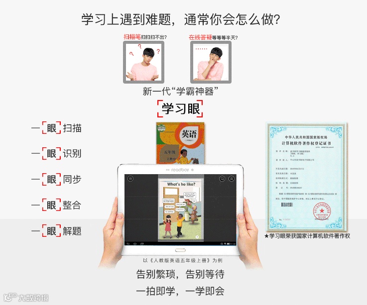 读书郎重磅推出智能学习应用—学习眼,融合场景文本识别与图像内容检索,课扫描课本任意页,最快2秒提供完善的学习方案,告别等待,畅快学习。