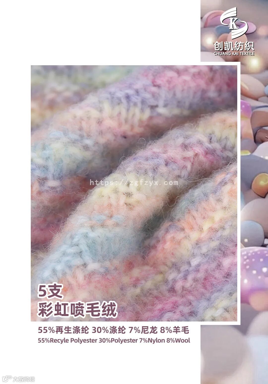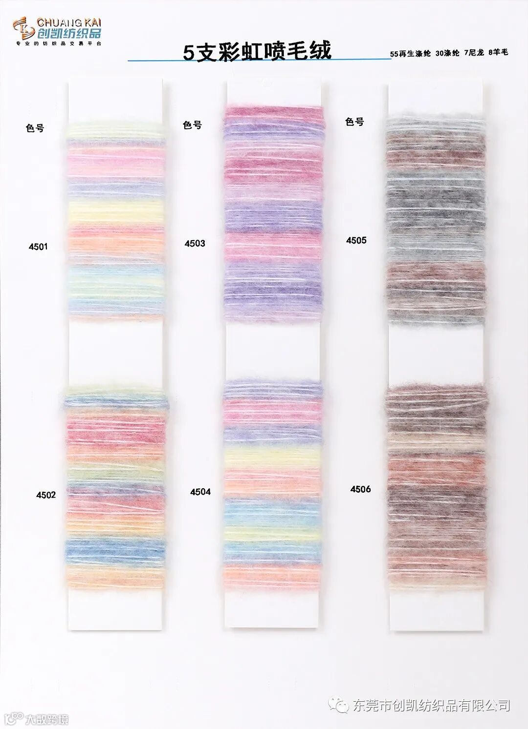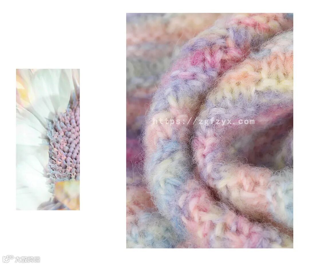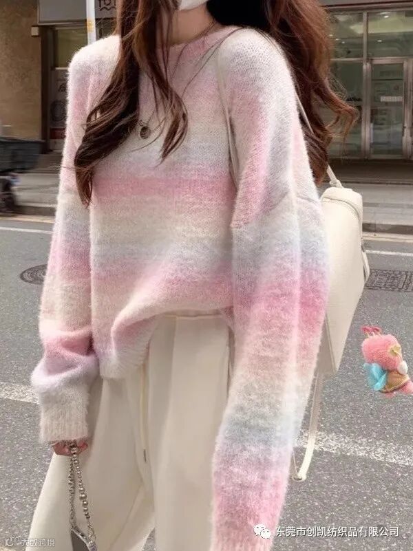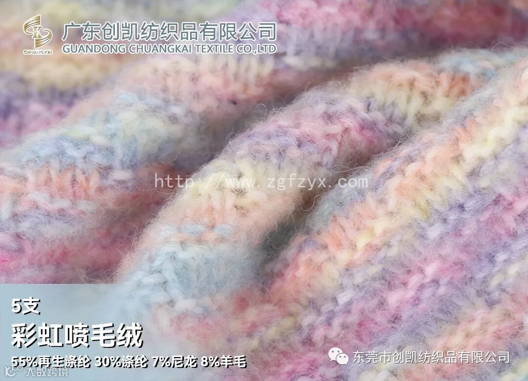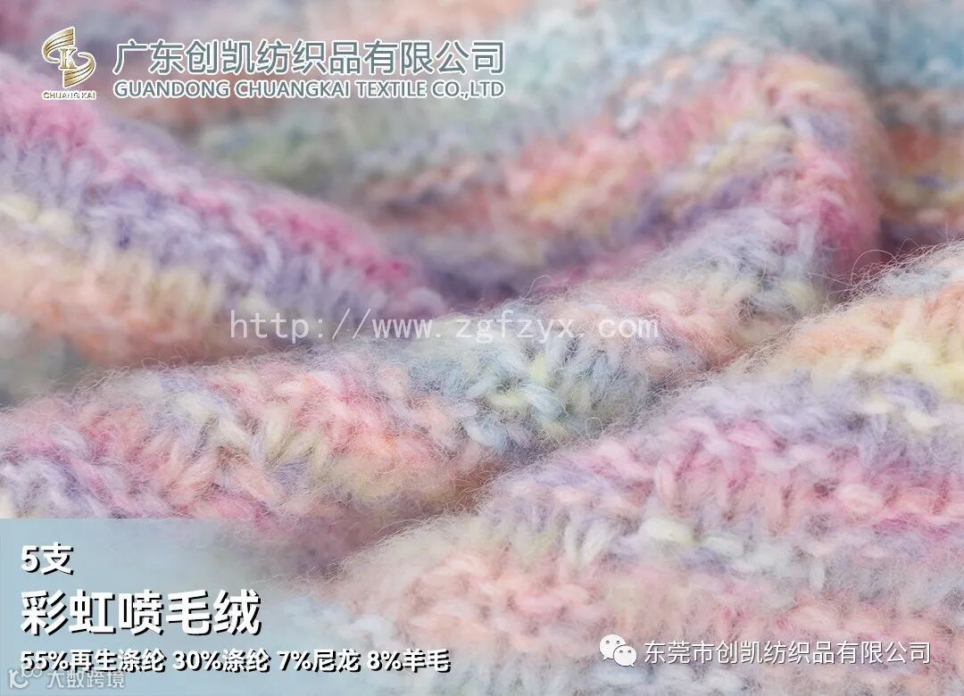 喷毛绒是花式纱中的一种,花式纱的品种也越来越多,花式纱因其具有鲜明的特色而备受关注,特别是近年来,花式纱快速成长,规模逐渐扩大,影响力度也逐年提升,它的种类丰富、色彩绚丽、风格各异的花式纱产品深受大众喜好。面料蓬松、柔软性佳、回弹性好,厚实温暖感的梦幻色彩非常治愈温柔。彩虹色增加时髦看点吸睛,还能展现舒适自由的一面。