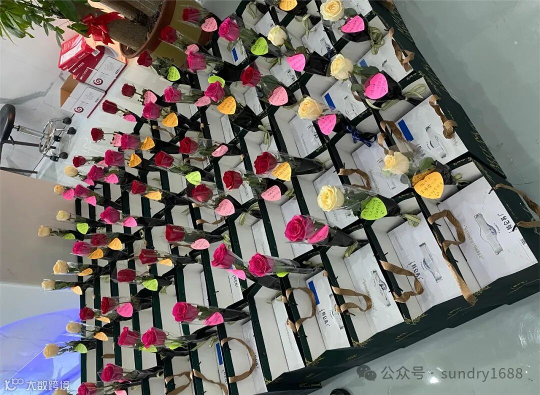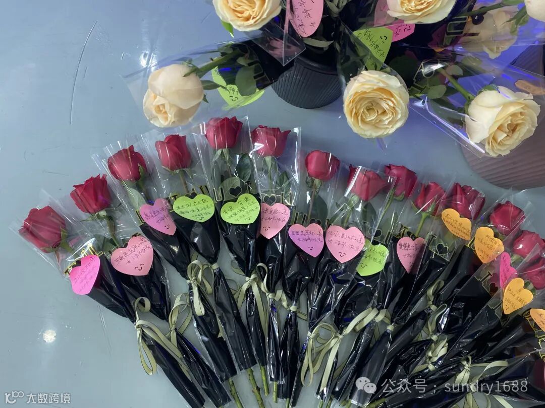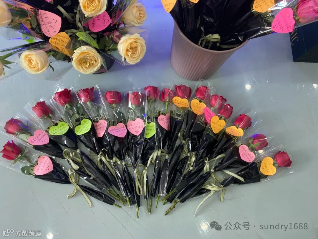 每位员工手里的鲜花都有同事特殊手写的不同祝福语,仪式感满满当当。