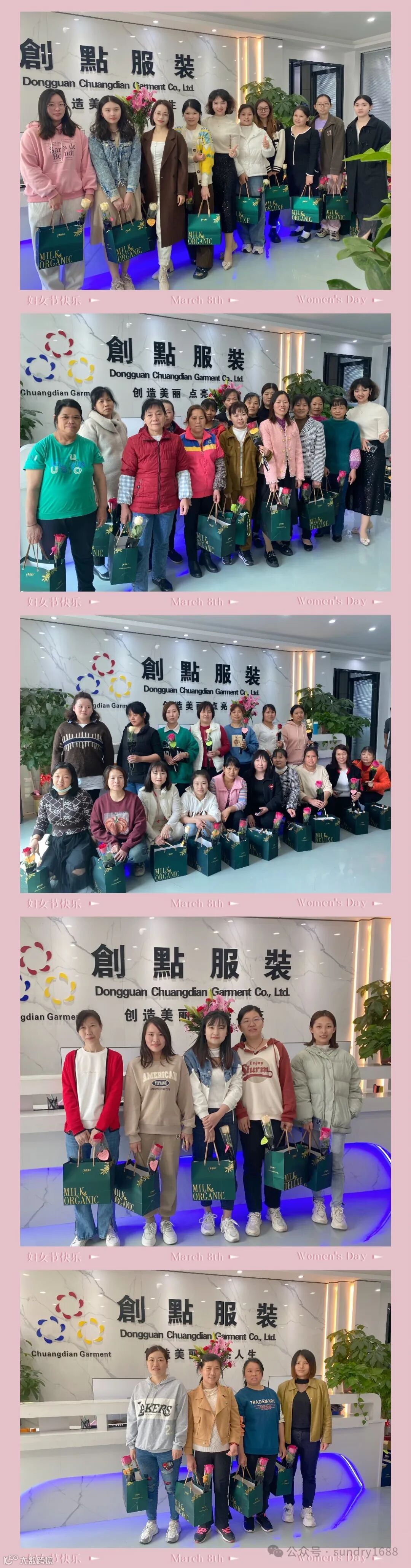 今天是“三八”国际劳动妇女节,创点服装致敬每一位辛勤劳动的女性,想把最美好的祝福送给创点服装的每一位女员工。