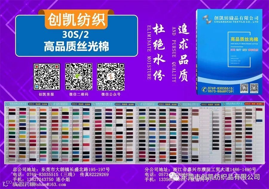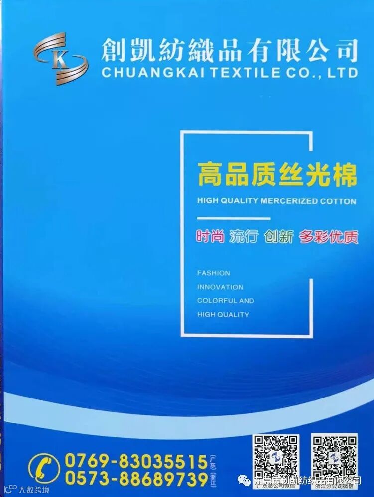东莞市创凯纺织有限公司,位于中国纺织基地--东莞大朗是一家集毛料开发,生产及销售为一体的纺织企业。多年来我们始终坚持以“成品最优化,质量最优化”的品质理念以做精品为目标,以服务客户为己任,致力于把“创凯”打造成纺织业内的知名品牌。公司产品产品质量上乘,价格优惠,极具环保,畅销全国各地。