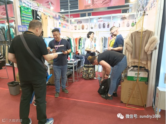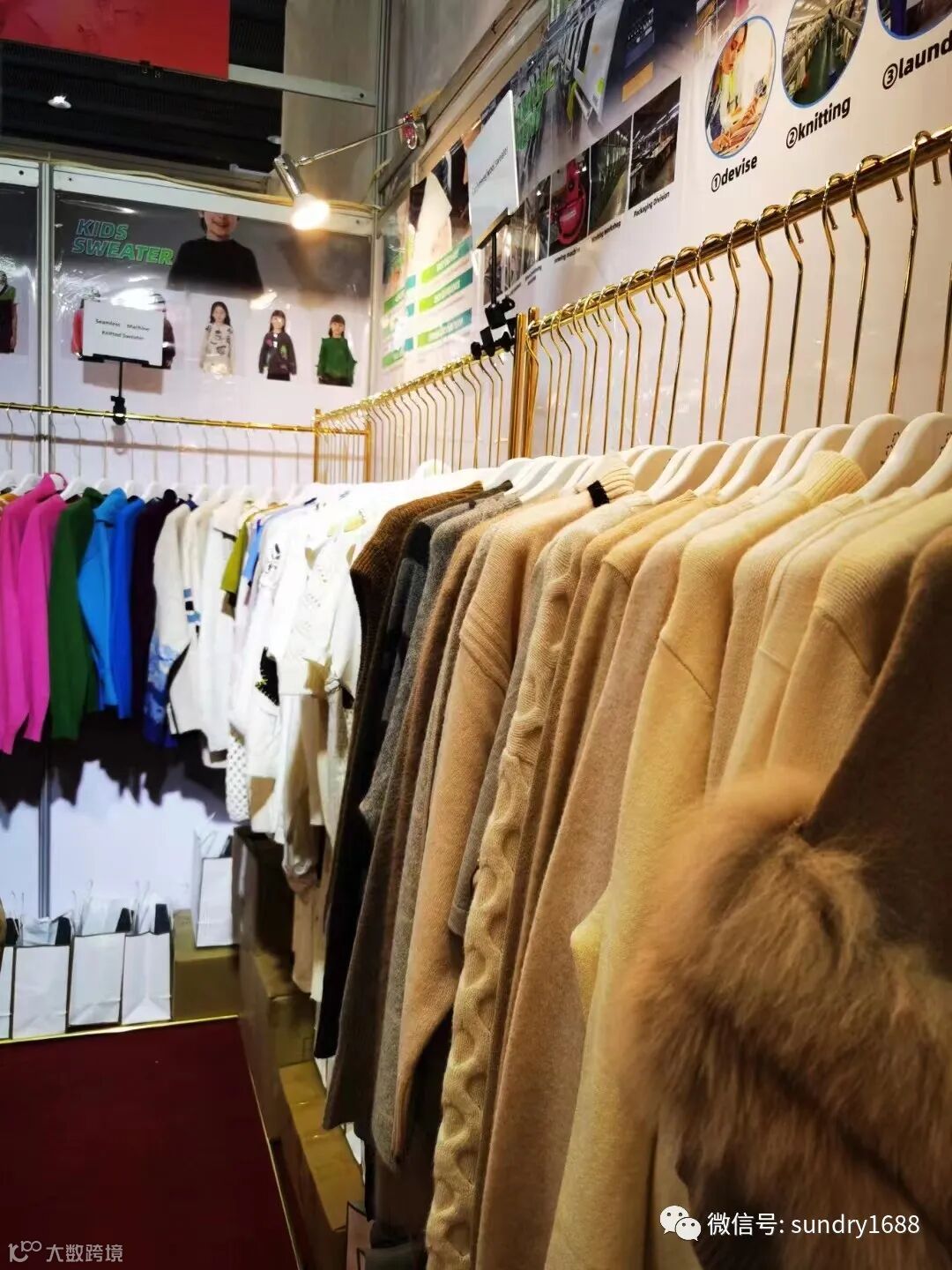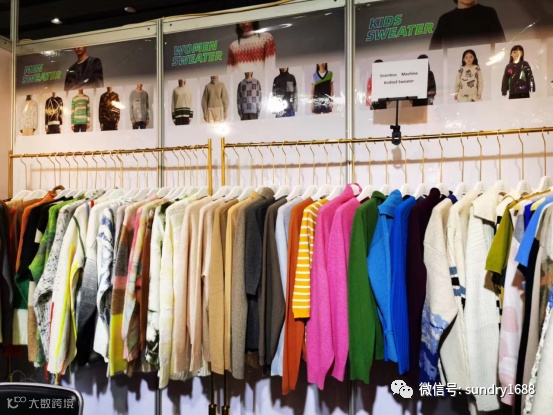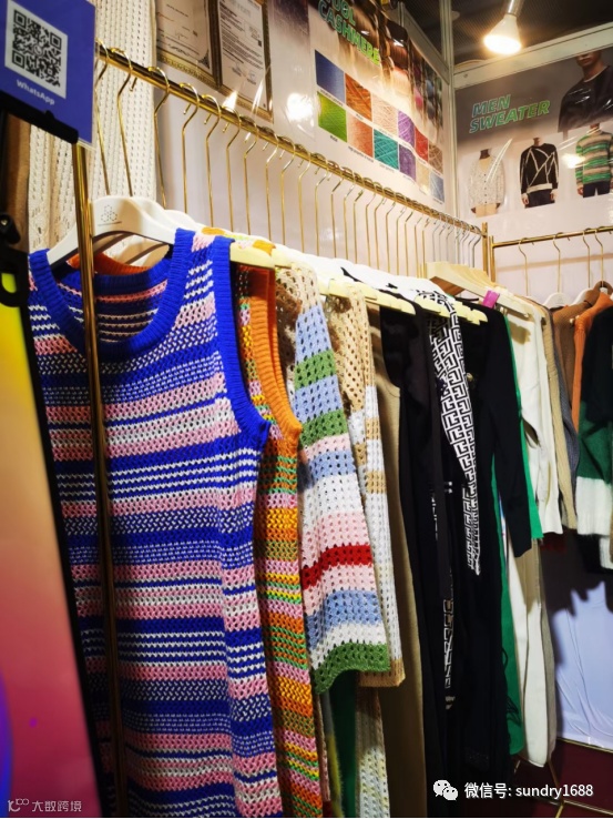 在展会现场,展示着本公司主推的商品,不同类目的产品一一呈现衣架上,各种色系、面料、工艺的产品琅琳满目。