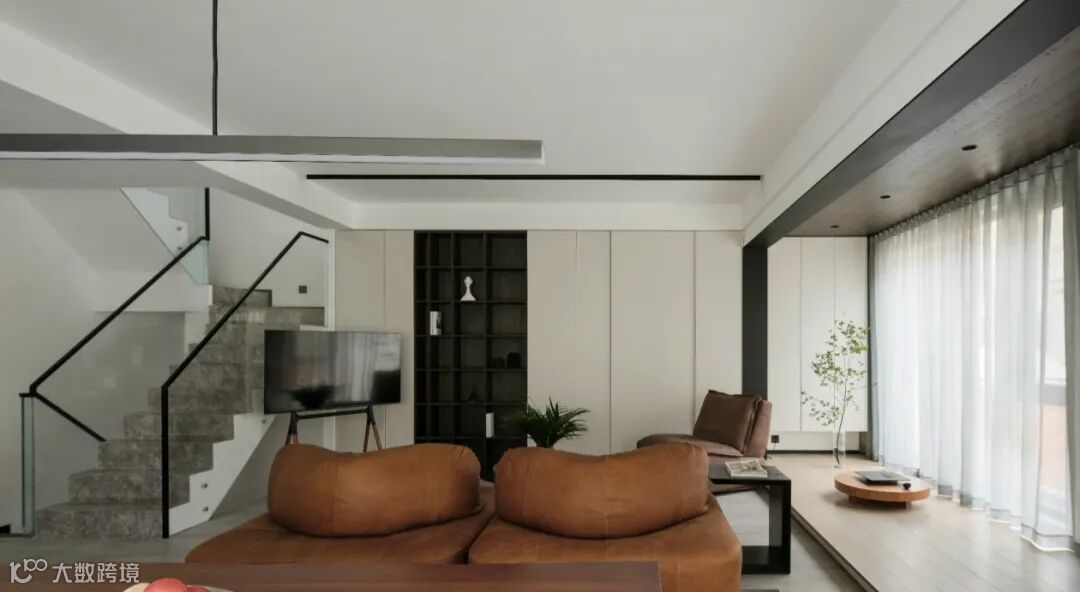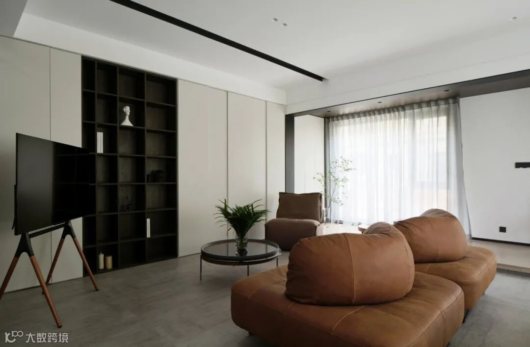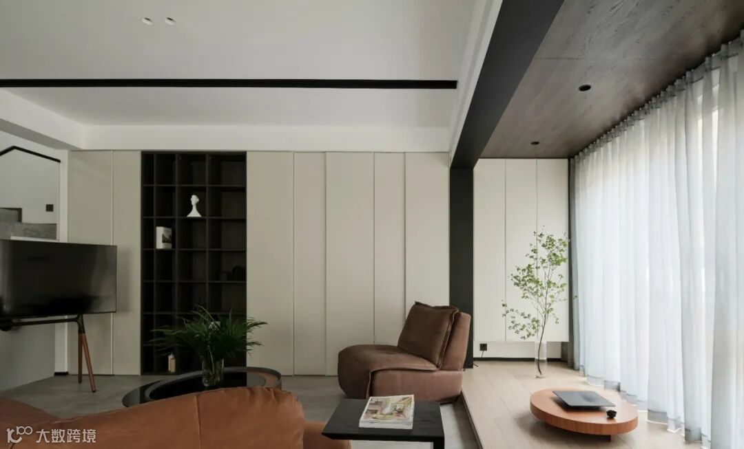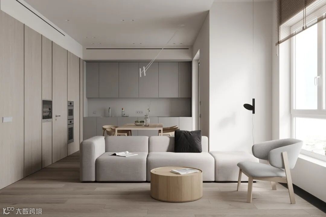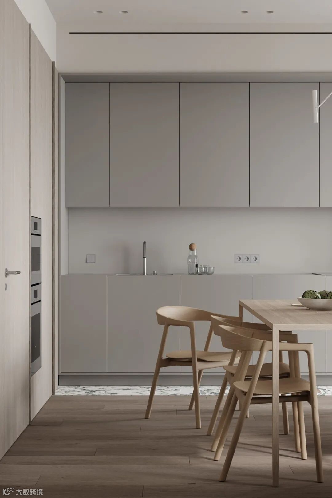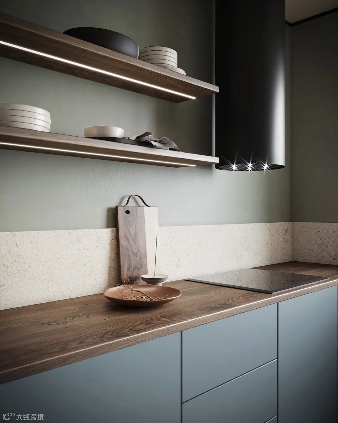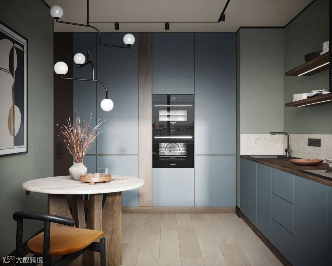 木饰面与灰蓝搭配的橱柜,打破了空间的单调与空旷