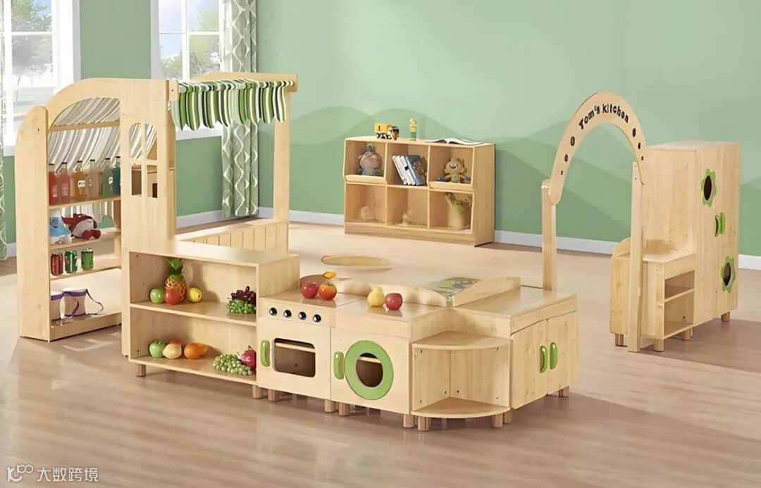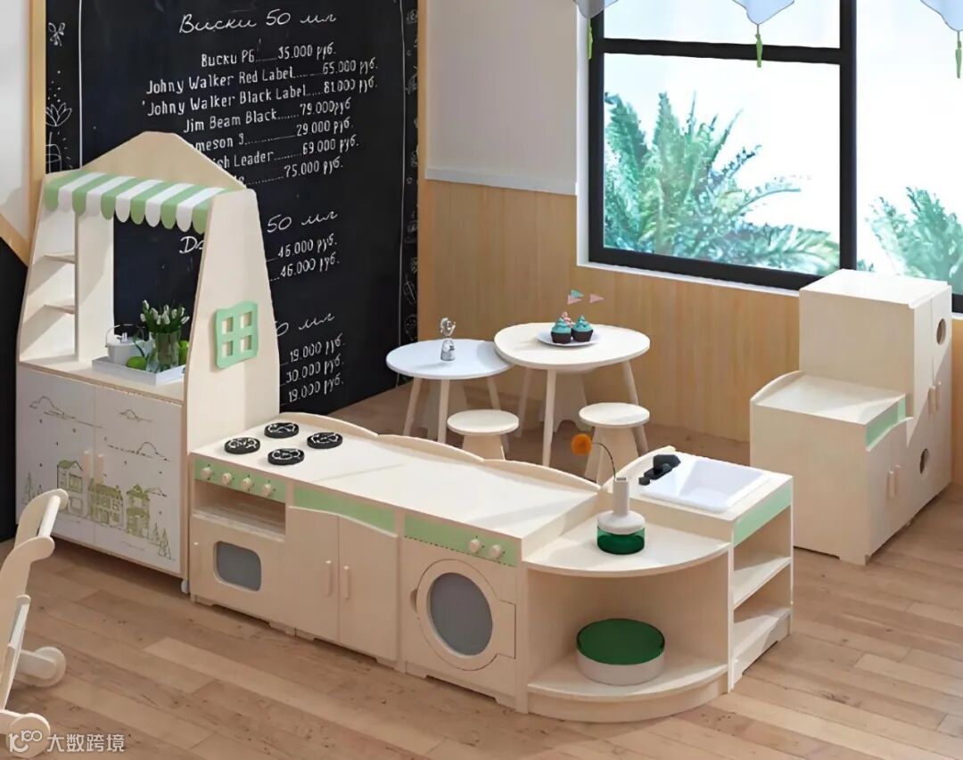 模拟厨房区简直是孩子们的美食创意工厂!爱森堡的模拟厨房组合柜配备了炉灶、水槽、餐具收纳区等,各种 “厨具” 一应俱全🍳 孩子们可以在这里扮演厨师,发挥创意制作美食,锻炼生活技能和创造力。