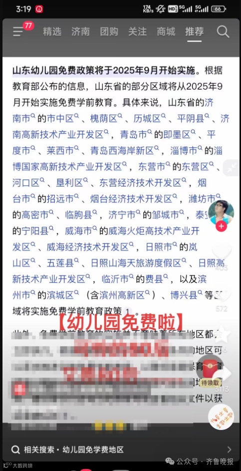 最近一段时间,“山东省的部分区域将从2025年9月开始实施免费学前教育”在多个短视频及社交平台流传,引发网友广泛关注。网传信息多以“教育部公布的消息”为开头,称山东省的部分区域将从2025年9月开始实施免费学前教育。
