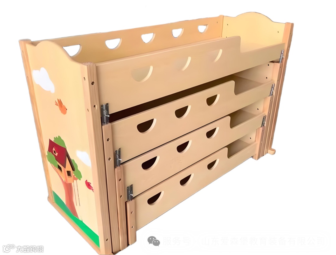 幼儿园四层床,材质为松木,尺寸160*62*105cm,涂层采用环保水性漆,安全环保无味,符合 GB 28007-2011《儿童家具通用技术条件》标准。