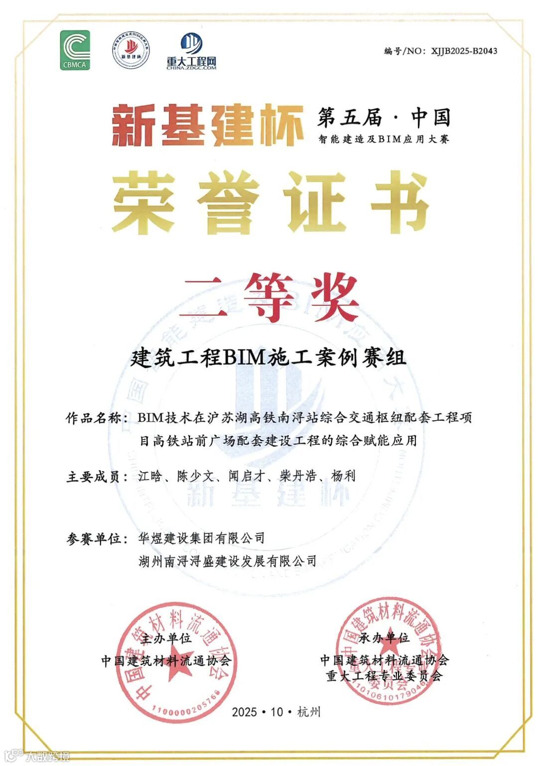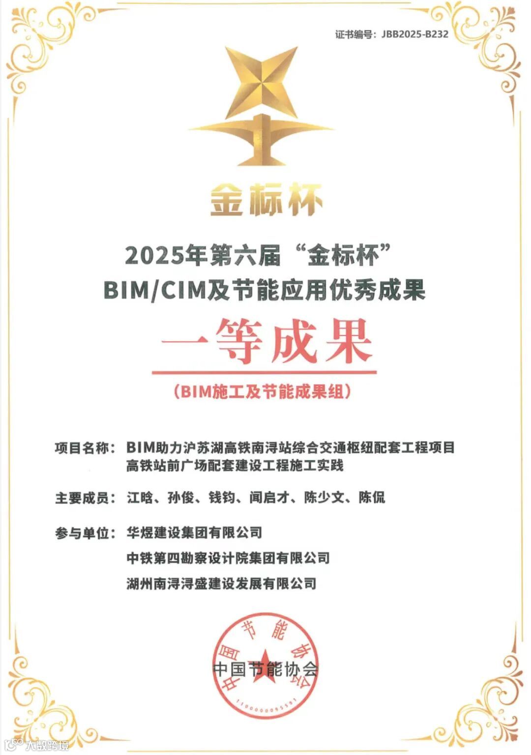 近日,华煜集团承建的沪苏湖高铁南浔站综合交通枢纽配套工程项目高铁站前广场配套建设工程,凭借BIM技术的综合赋能应用,获评“金标杯”一等成果与“新基建杯”二等奖,彰显了行业对集团技术实力与项目落地能力的充分肯定。