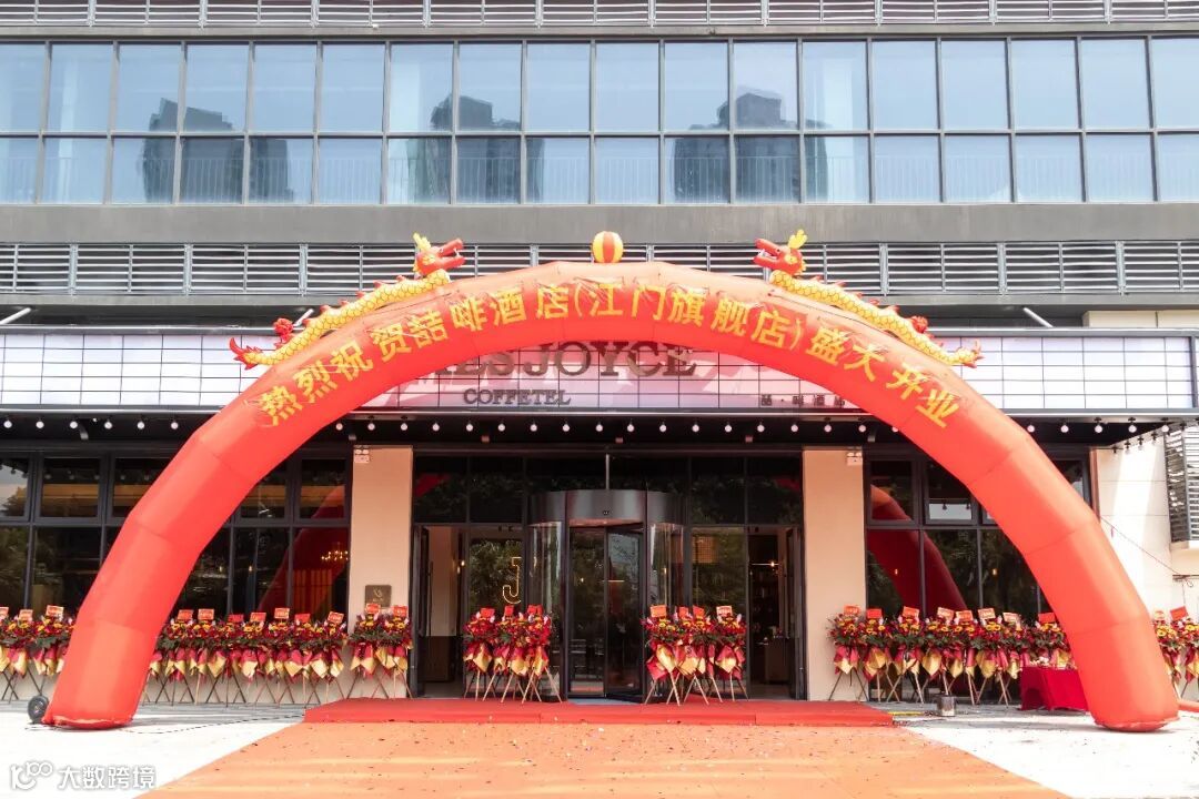 开业仪式在江门市蓬江区天宁路喆·啡酒店(4.0江门五邑大学三十三墟街旗舰店)隆重举行。现场贵宾云集,气氛热烈,大家共同见证这一辉煌时刻。在热烈的掌声中,集团领导为酒店揭牌,红绸落下,“喆·啡酒店”的招牌熠熠生辉,标志着酒店正式投入运营。