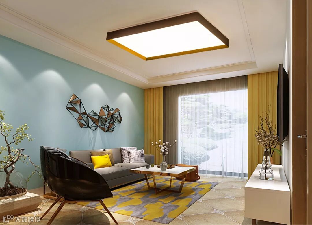 例如,电视两侧增加射灯,照射在装饰画、绿色植物上,可以增加装饰性,突出绿色植物的生命力,营造更加生活化的氛围。