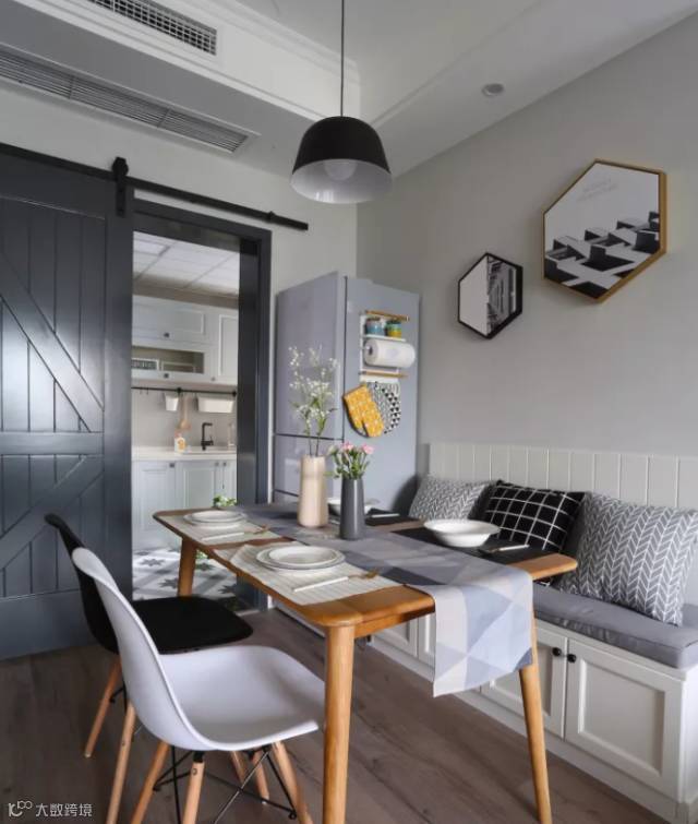 精致的餐具与清新的鲜切花,体现女主对生活的热爱。灰色谷仓门是厨房的入口,隔离油烟的同时,也提升了餐厨区的颜值。