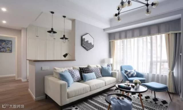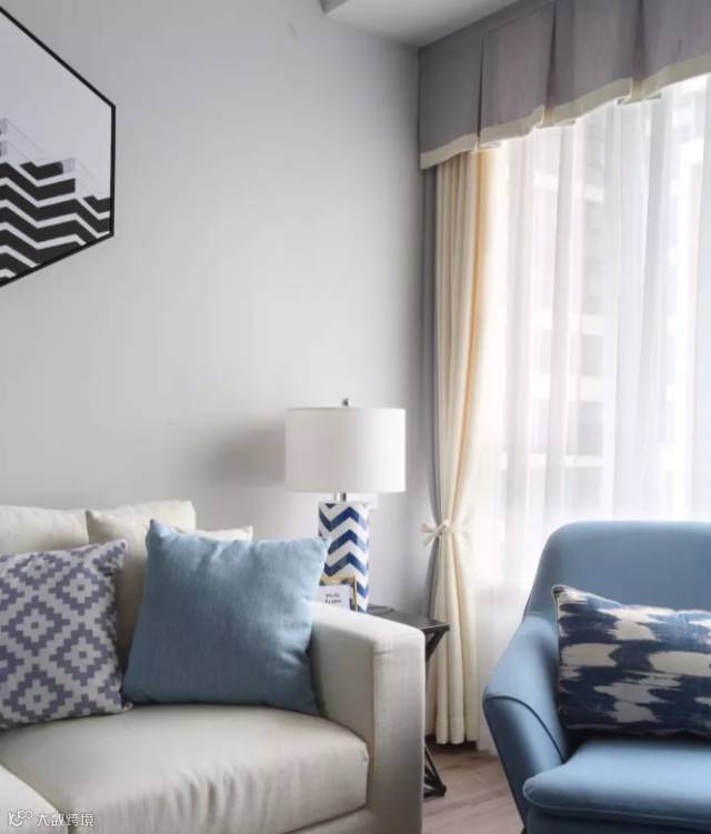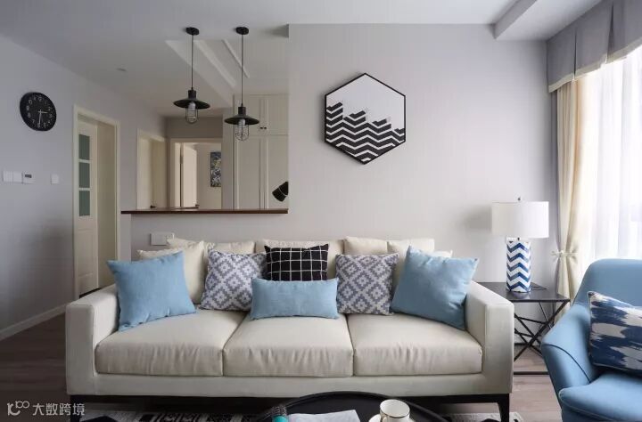 米色的布艺沙发搭配几何图案的抱枕,松石蓝的单椅呼应靠枕与台灯色调,灰色背景墙与白色顶面形成对比,丰富层次,一幅六边形装饰画让墙面赋有节奏感。