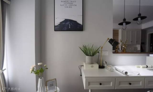 书房白色家具搭配墙面的黑色简框画与台灯,形成黑白灰的基调,金色元素与绿植,呈现清新质感的空间。